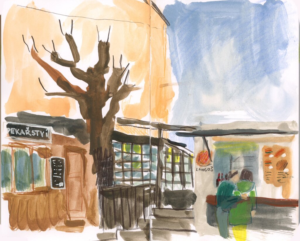 The outdoor area has the column heaters. Additionally, there are multiple indoor places where you can sketch as well- Kavárna Orient, Vinárna u Myšky or Hospůdka na konci světa.