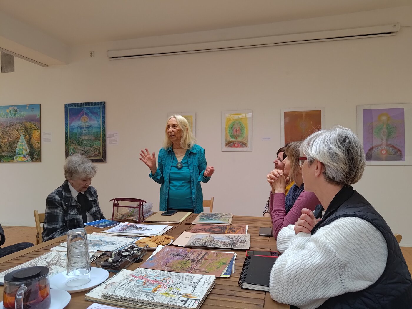 “The event at the Tibet Open House gave me another opportunity to enjoy Hana’s exhibition. Her paintings feature a wild mix of spirituality, mysticism, and symbolism, wrapped in mystery. Her sketches have a delightful variety and playfulness, and the ones she drew with crayons on colored paper are so impressive. Thank you Hana for all the inspiration, enriched even more by a demonstration of yoga and tai chi. Thank you Lenka for organising this event.” - Jana
