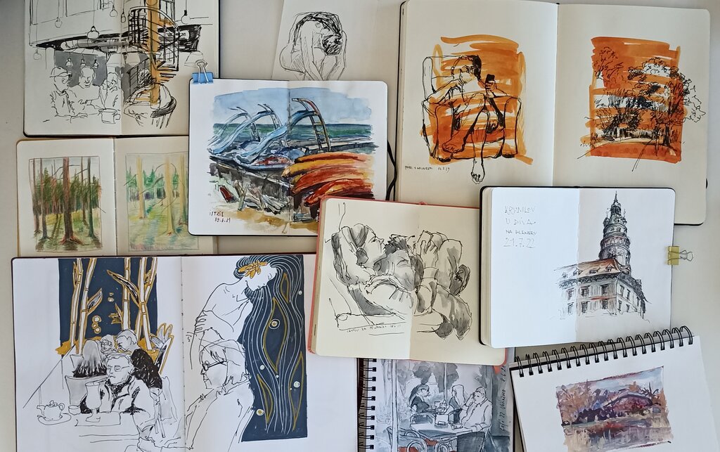 In addition, I see sketching as a great way to loosen up one's artistic expression because one does not have to be afraid to experiment in a sketchbook. And although I am still at the beginning in this direction, in the year that I have been participating in the activities of USK Prague, I am beginning to perceive a certain shift: improving and simplifying my drawing, expanding my repertoire of techniques and materials, etc.