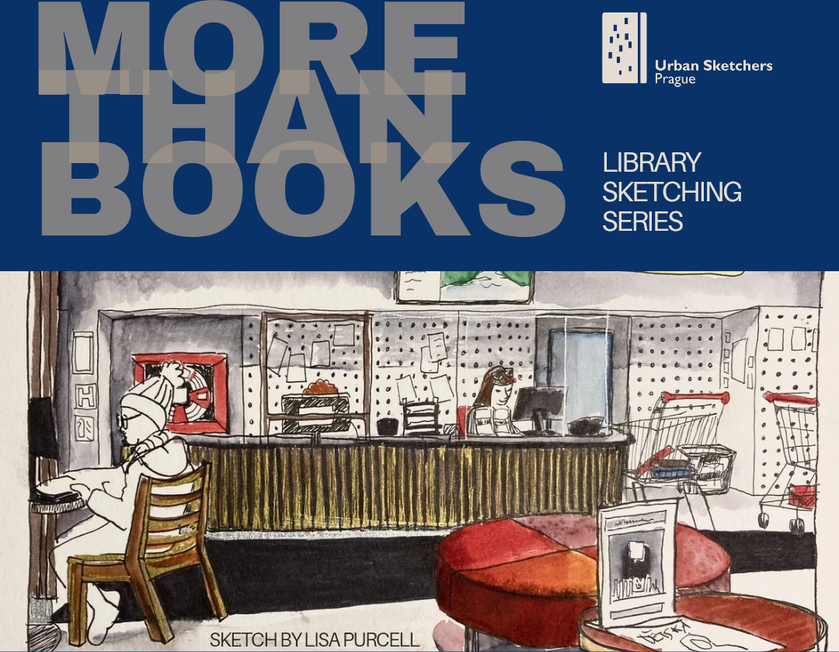This exhibition is the culmination of a wonderful five-month collaboration between Urban Sketchers Prague and the Municipal Library of Prague. Our members visited nine branches, sketching the quiet moments, the lively interactions, and the beautiful architecture that gives each location its distinct vibe.