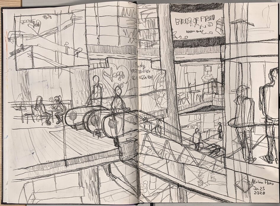 Let's sprawl around this mall to sketch. There are many cafes, restaurants, escalators, nice architecture, and groups of interesting people for us to draw.