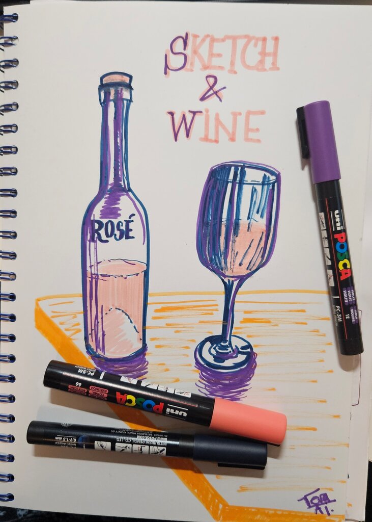 Let's sketch during the Degustational Festival of Rosé and Claret. "Ladies in elegant hats and gloves, men accompanying them, both with glasses of rosé in their hands. An occasional dance and a great atmosphere!"