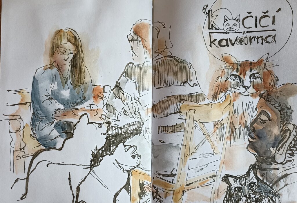 Urban Sketching: Kočičí kavárna, ta ze Smíchova