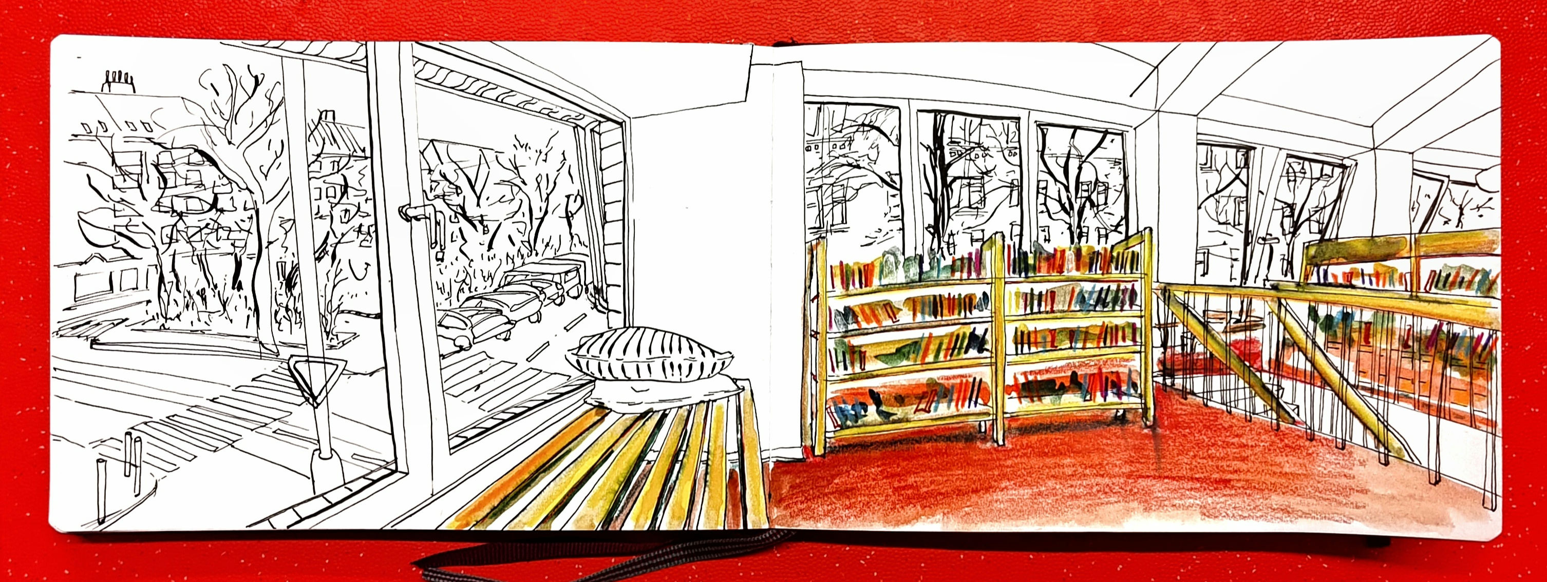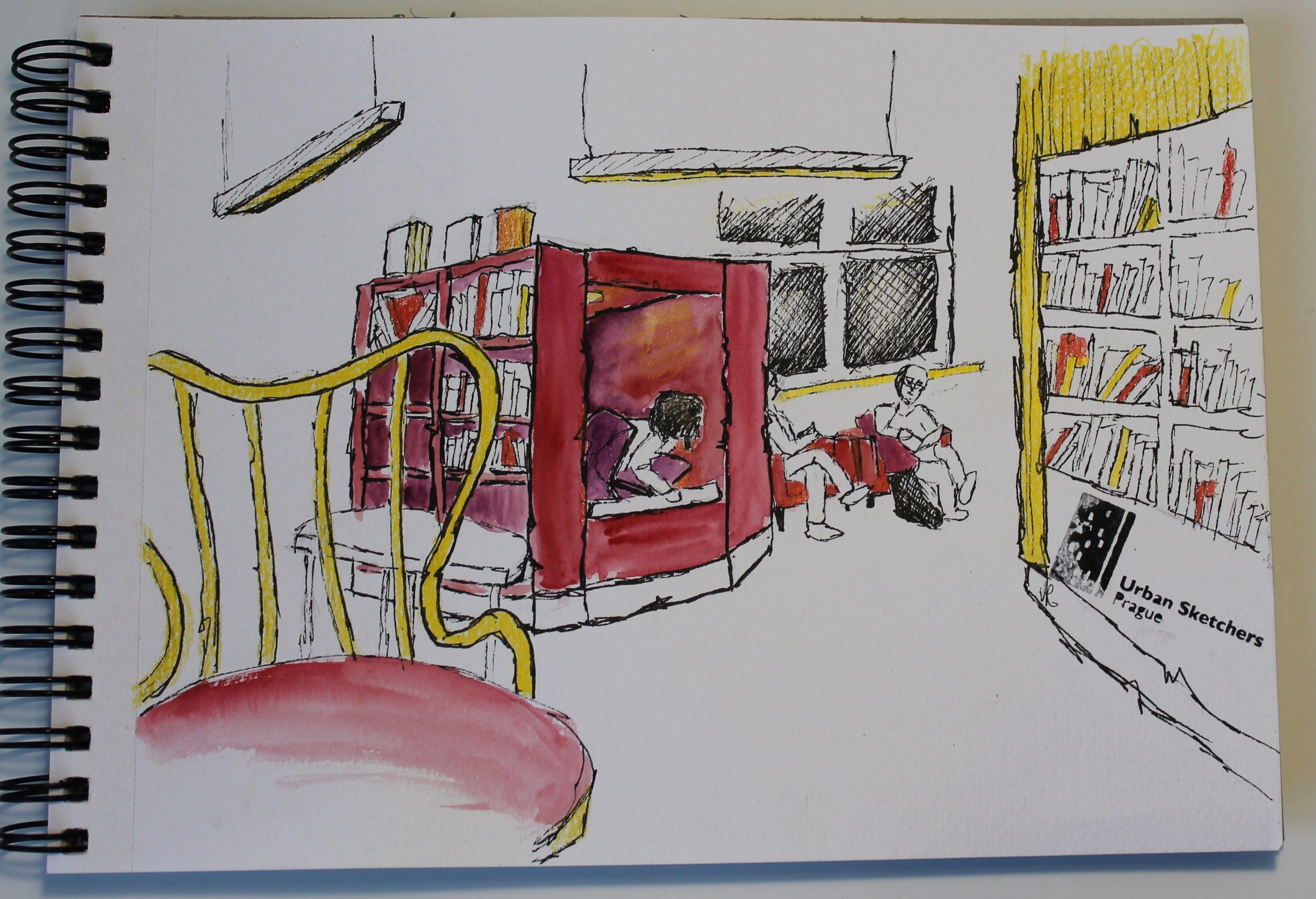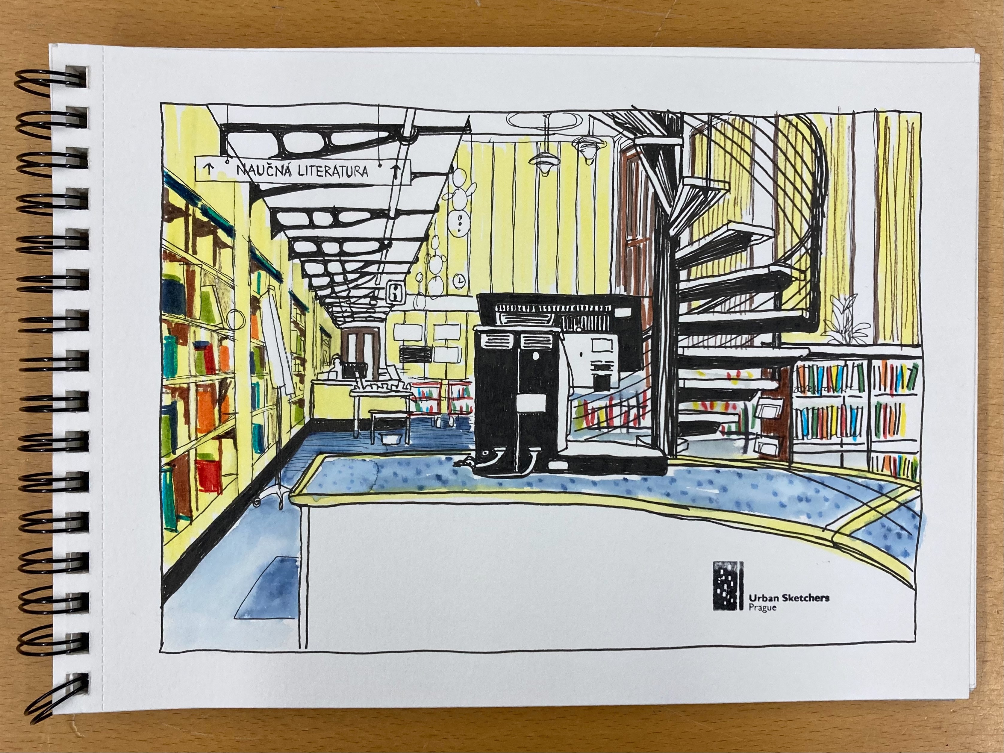 A shared belief that "libraries are far more than just books: they are vital hubs of our communities" was the spark for nearly 50 sketchers from around the world who joined the project. Our warmest thanks go to Alžběta Pavlíčková for opening the library doors to us with such enthusiasm.